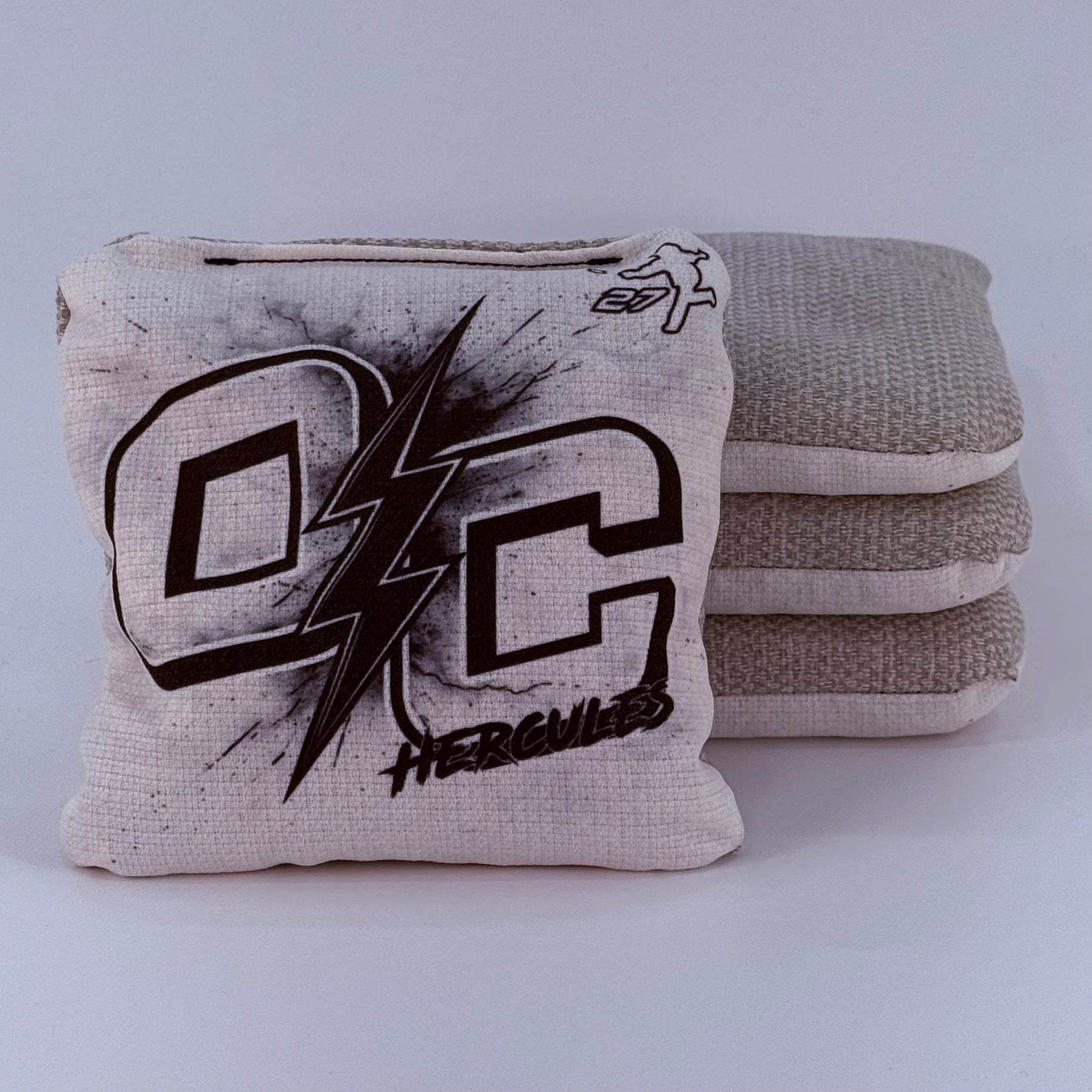 The Hercules is a hybrid carpet, that has become immensely popular in the cornhole scene. The slow side tends to stay truer to its speed than most other hybrid carpets. While most are heavily affected by humidity and changing board conditions this fabric remains relatively consistent. The “speed rating” would be considered a 6/9 via most companies that have used these materials. We are however doing something a touch different in the manufacturing process that aids in that fast side staying on the quicker end of 9 really allowing the thrower to blow through just about every pile in your path and collect those bags on the sides. The template is a touch larger but not too much bigger than the standard ‘Kratos’ template. The bag tends to be fuller in nature but is extremely malleable. In testing we have stretched sets to get them very floppy, and broken sets in on high heat to shrink them to your liking. So however you like it, it can fit your style! The resin in this bag is a proprietary blend that we have found to aid in hole friendliness, while not ‘kicking’ unless intending to do so via a cut shot. This bag has the perfect blend to really take on every scenario you throw in its path. With this bag, be ready to climb atop those podiums just like Hercules did Mount Olympus!